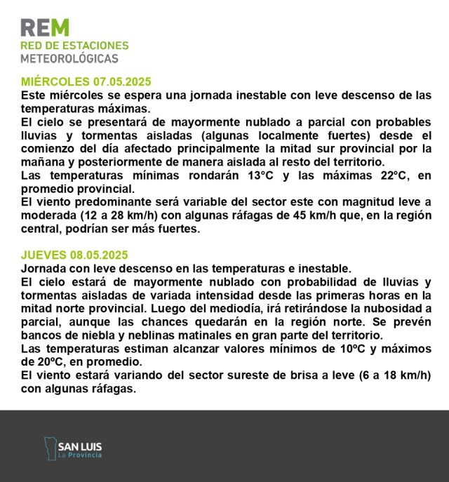 La Red de Estaciones Meteorológicas (REM) anticipó que para este miércoles se espera un leve descenso de temperaturas máximas que no superarán los 22° en promedio y la mínima será de 13°C. También, anticipó que será una jornada inestable acompañada por un cielo parcialmente nublado con posibles lluvias y tormentas aisladas, afectando principalmente la mitad del sur provincial.
